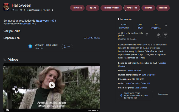 Además, si estamos "logueados" con nuestra cuenta de Google, podremos editar las plataformas que tenemos contratadas pulsando en "Editar servicios". De esta forma, Google nos mostrará donde podremos ver el contenido con lo que tenemos contratado. Un ejemplo lo tenemos con "Halloween", que ahora mismo está presente en Amazon Prime Video.